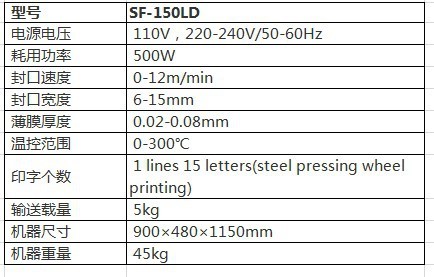 Sf150系列多功能薄膜封口机适合于塑料袋的封口包装,采用电子恒温控制和无极调速傅动:可封合各种材料的塑料薄膜(PE,PP,铝膜等),还可配上压痕印字装置:我司最新款一微电脑控制系统,还配有遍数功能。(FRDl000)